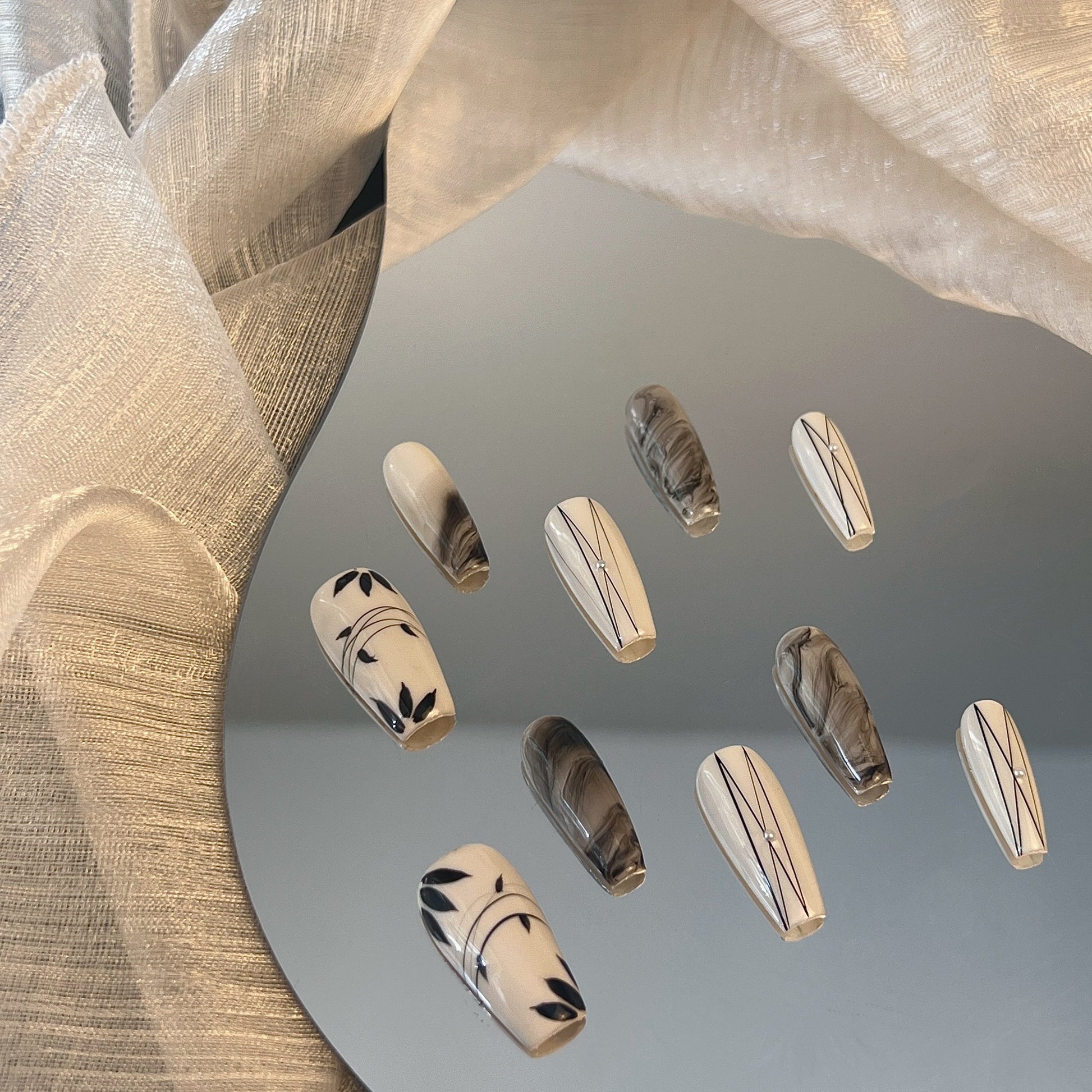 Quality & Durability: Handcrafted with premium salon-grade gel, Bamboo Shadows of JiangNan Nails are designed for durability and a chip-resistant finish. With careful application and gentle removal, these nails are reusable, offering an eco-friendly and budget-conscious way to enjoy stunning nail art. Choose adhesive tabs for 3-7 days of wear or solid nail glue with UV lamp curing for up to 4 weeks of flawless elegance.
