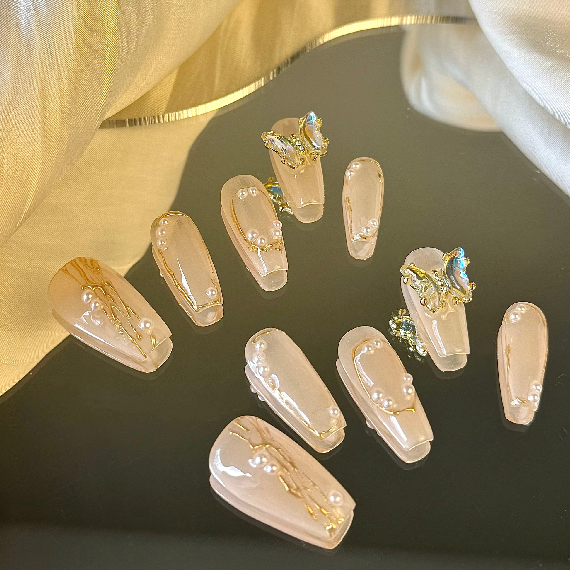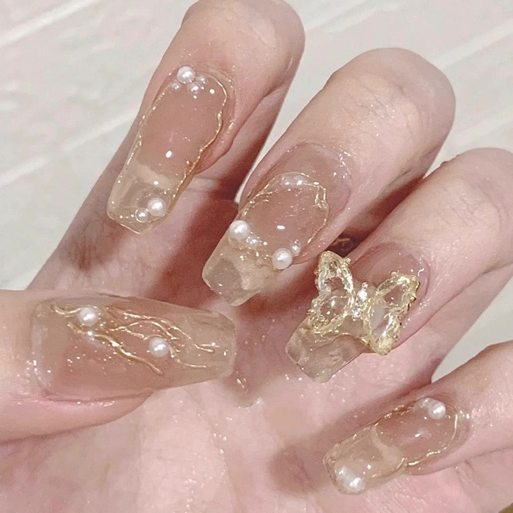 Design & Inspiration: Butterfly Baroque Nails channel 2025’s maximalist trend with a deep burgundy base, adorned with gold butterfly motifs and intricate pearl embellishments. The long-length, stiletto-shaped design evokes Renaissance grandeur, perfect for gala nights or those who adore a dramatic, aristocratic aesthetic. These nails are a masterpiece of elegance.