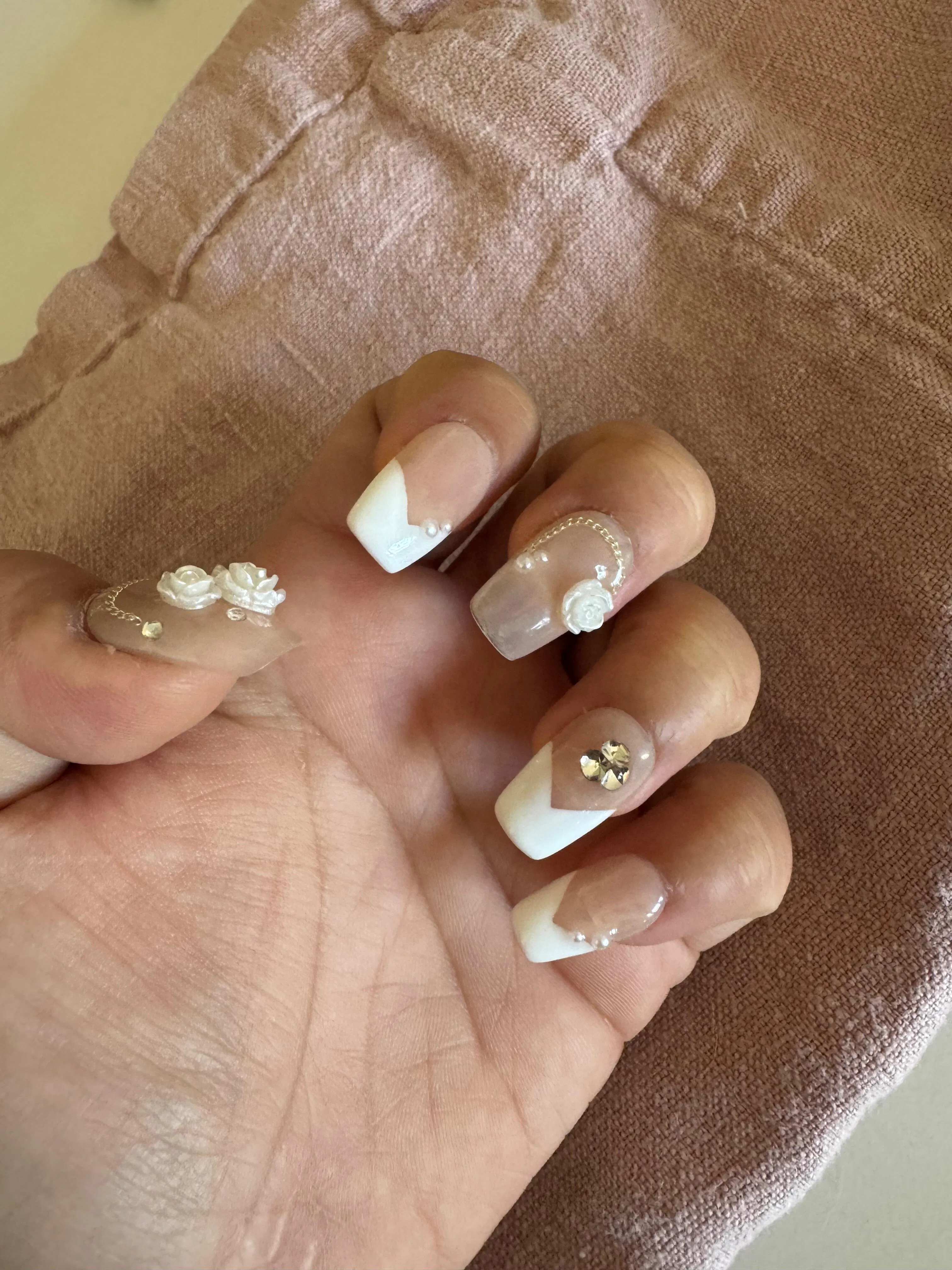 This set features a sheer milky-nude base paired with crisp V-cut French tips for a clean, elongated look. 3D white camellia flowers bloom softly across the accent nails, creating a refined, couture feel inspired by classic elegance. Subtle champagne shimmer, pearl beading, and delicate crystal accents add just the right amount of glow—luxurious, feminine, and never overpowering.