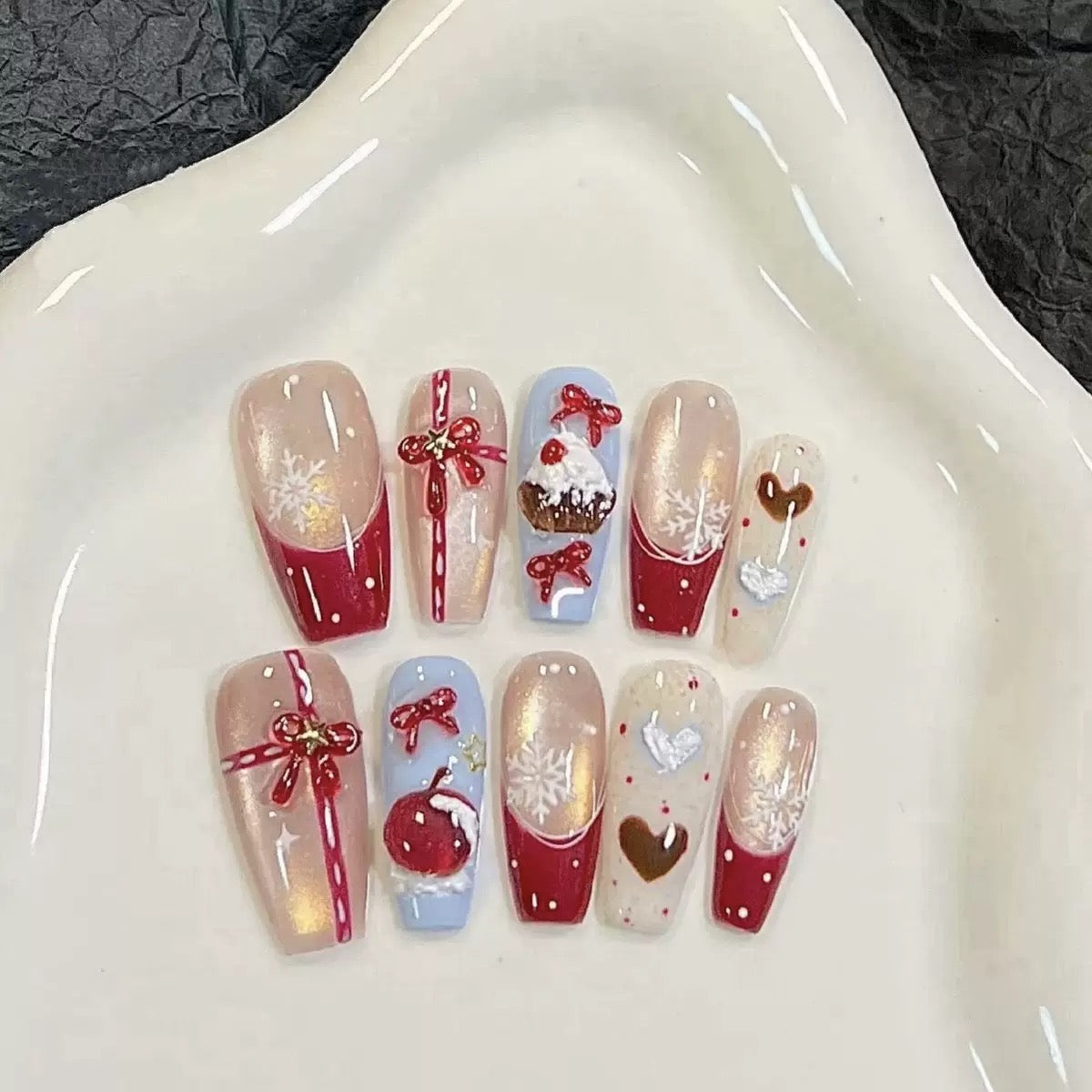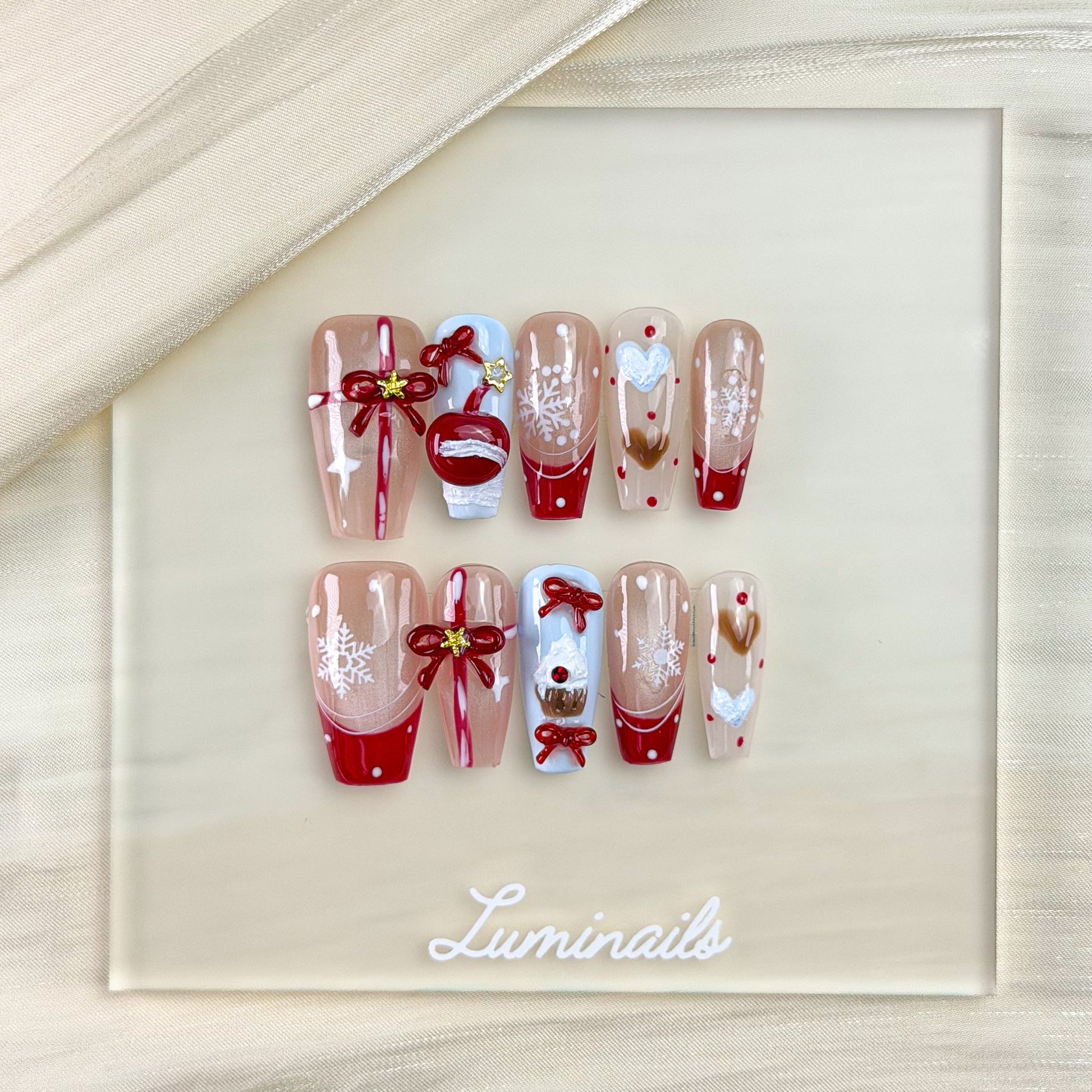 Cherry Sweetheart Christmas Nails blends milky nude and warm beige with glossy cherry red tips, tiny hearts, and delicate snowflakes. 3D ribbon bows and gift-wrap details make each nail feel like a little present, while the subtle shimmer keeps everything elegant instead of overly cutesy.