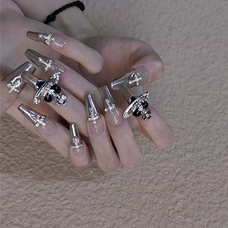 Design & Inspiration: Galaxy Believer Nails capture 2025’s celestial trend with a deep navy base, swirled with purple and silver holographic glitters, evoking a starry galaxy. The long-length, stiletto-shaped design features star and moon accents, perfect for dreamers or those who adore a bold, cosmic aesthetic. These nails are out of this world.