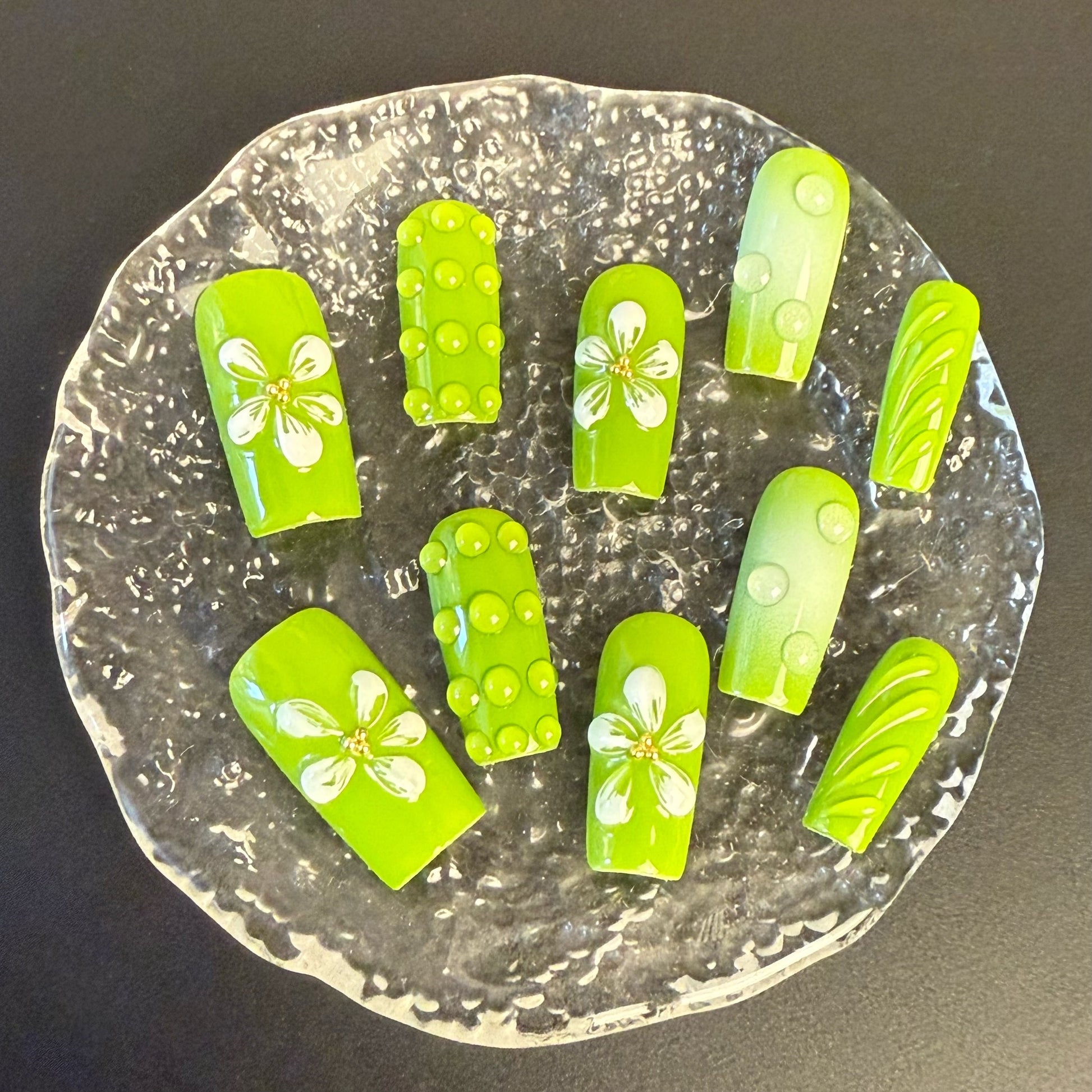 Quality & Durability: Handcrafted with premium salon-grade gel, Lime Blossom Nails are designed for durability and a chip-resistant finish. With careful application and gentle removal, these nails are reusable, offering an eco-friendly and budget-conscious way to enjoy stunning nail art. Choose adhesive tabs for 3-7 days of wear or solid nail glue with UV lamp curing for up to 4 weeks of flawless elegance.