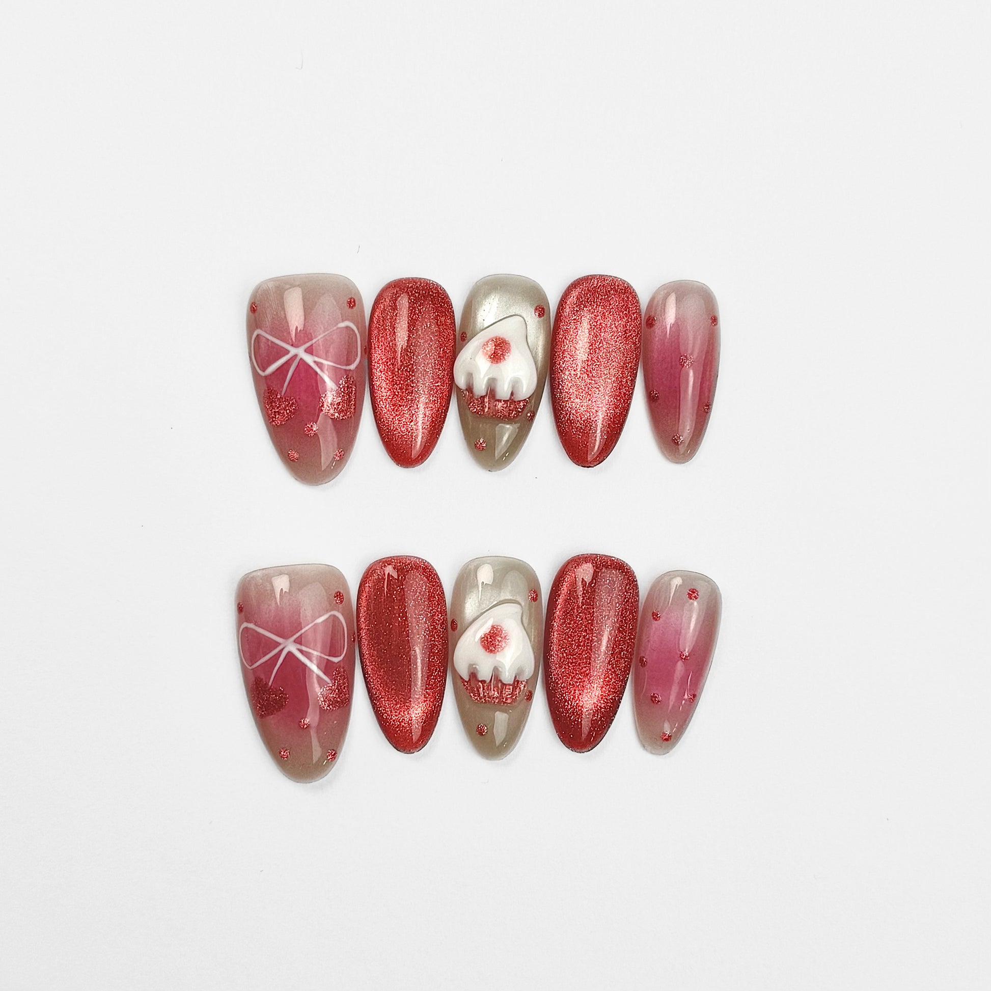 Indulge in sweetness with Strawberry Cake Almond Nails by Luminails, where luxury meets delectable charm in our handmade press-on nails. Crafted by expert artisans, these nails deliver salon-quality sophistication in just 10 minutes, complete with a free toolkit included with every purchase. 💅