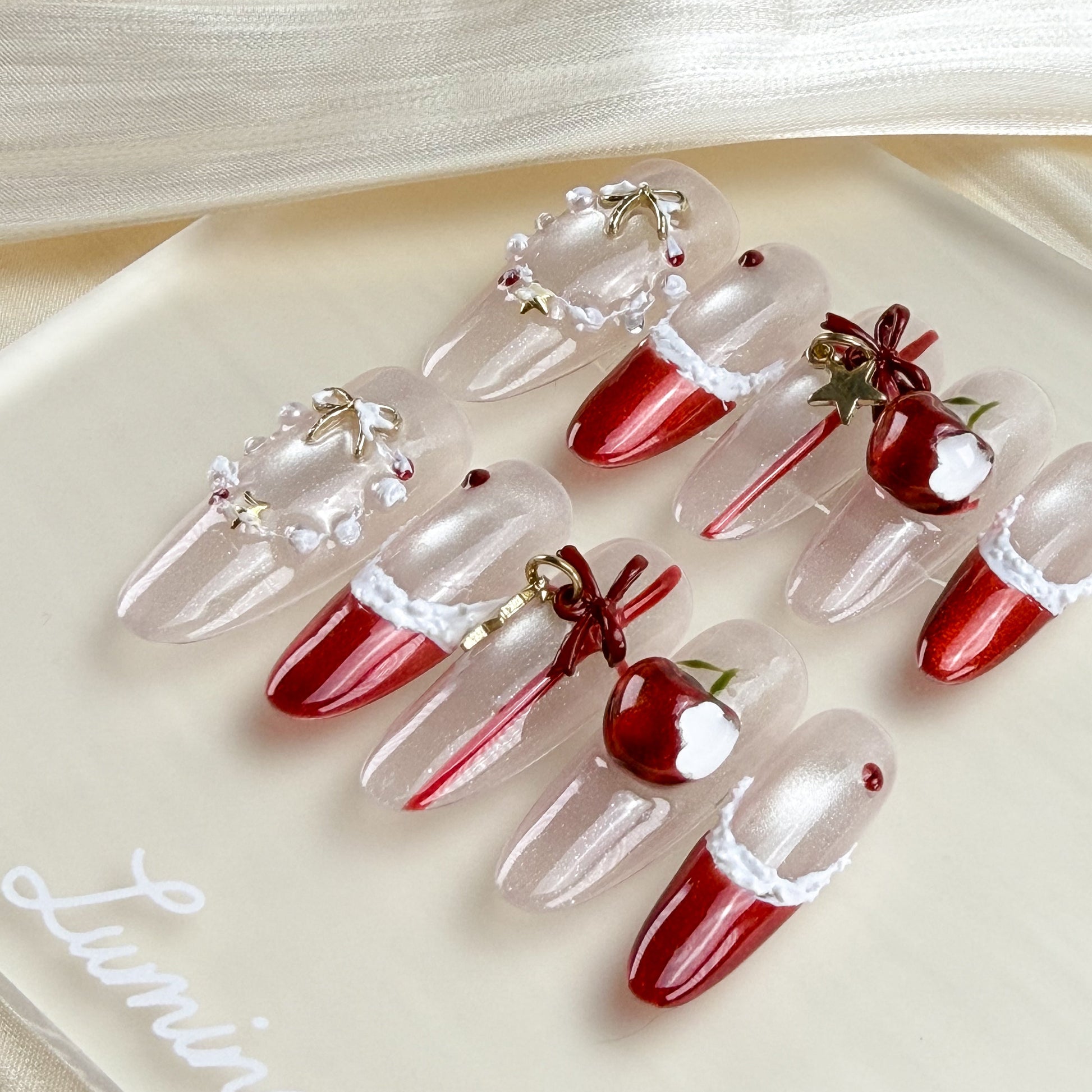 Velvet Noel Nails mixes champagne shimmer with deep velvet red, trimmed in a soft “snow” edge that feels like a luxe holiday coat. Delicate pearls, tiny gold bells, and a glossy red ornament charm add just the right amount of festive drama while still looking elegant and grown-up.